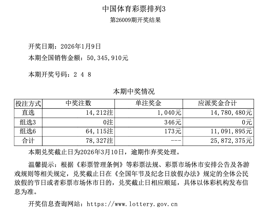 排列3 第26009期开奖 2 4 8