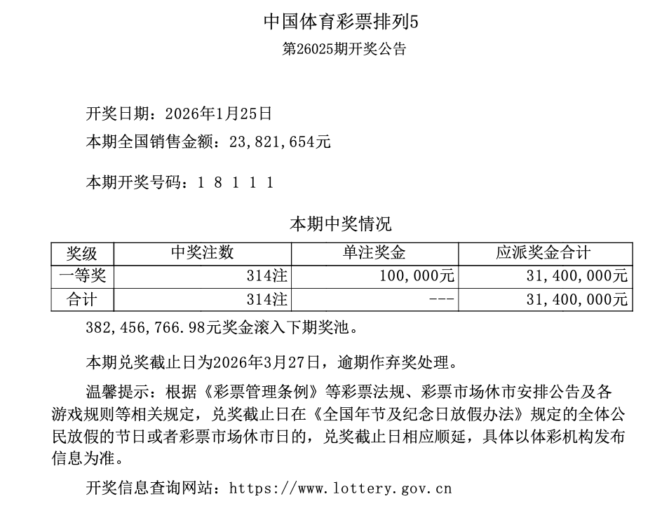 排列5 第26025期开奖 1 8 1 1 1