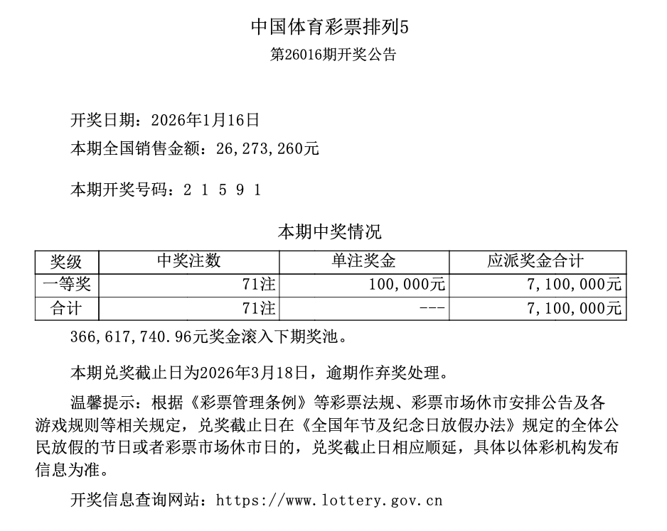 排列5 第26016期开奖 2 1 5 9 1