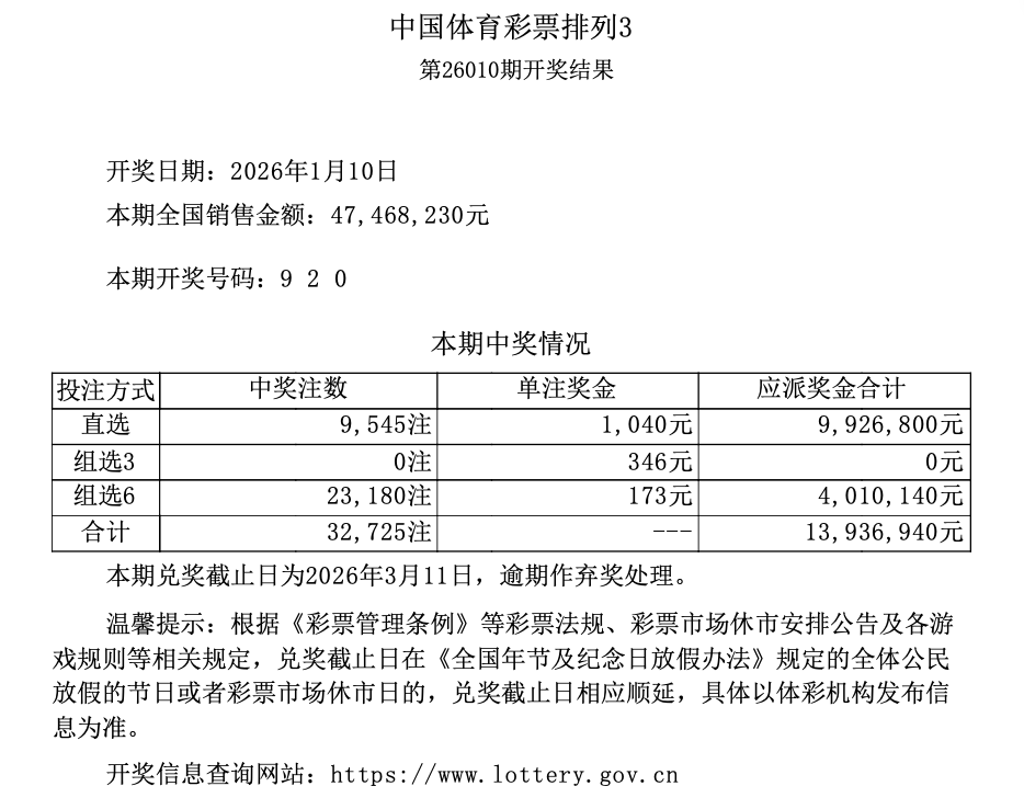 排列3 第26010期开奖 9 2 0