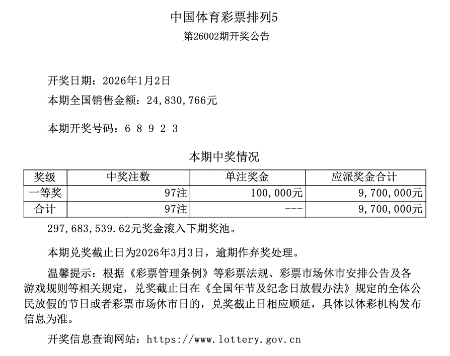 排列5 第26002期开奖 6 8 9 2 3