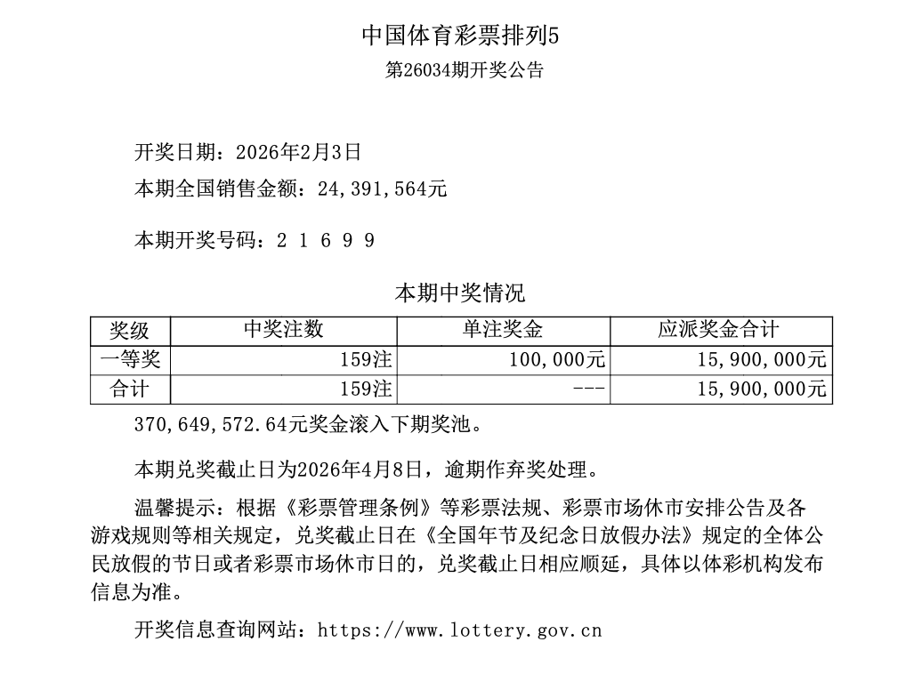 排列5 第26034期开奖 2 1 6 9 9