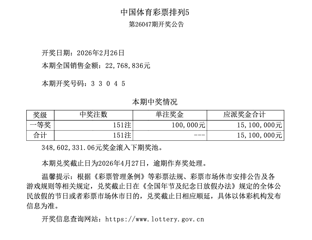 排列5 第26047期开奖 3 3 0 4 5
