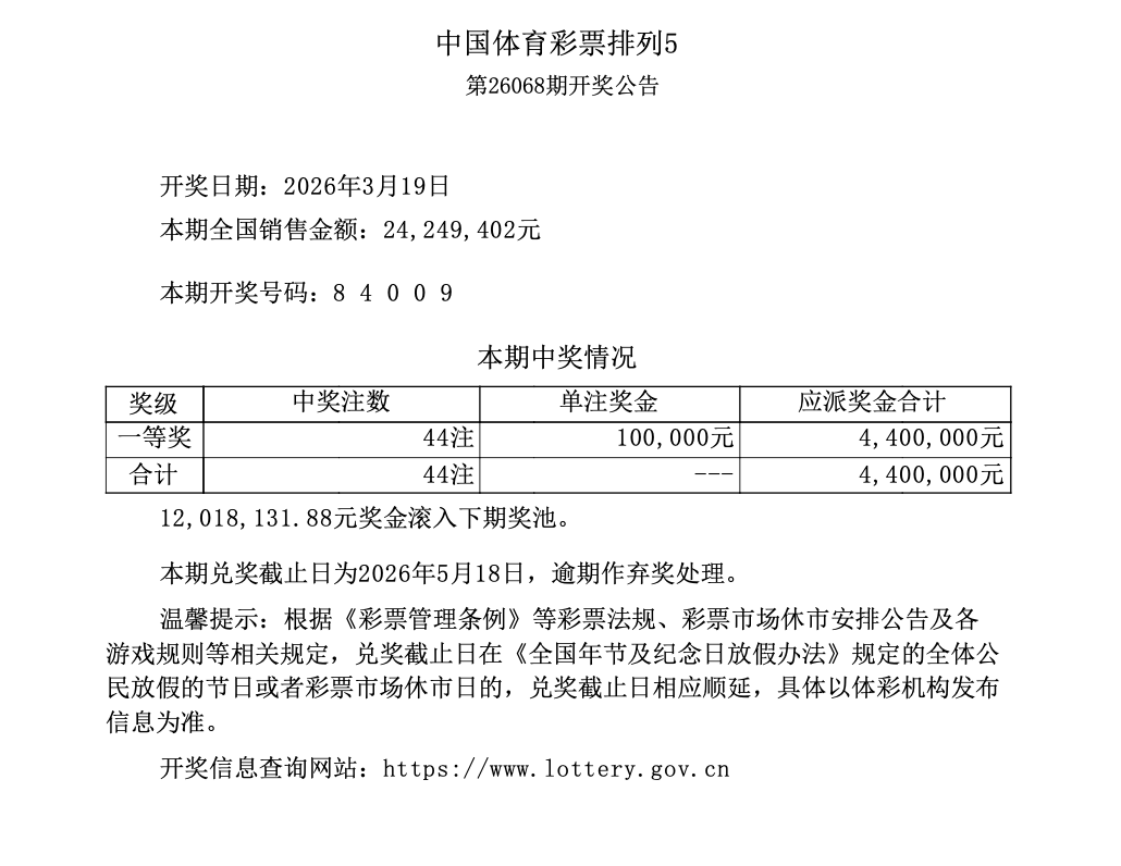 排列5 第26068期开奖 8 4 0 0 9