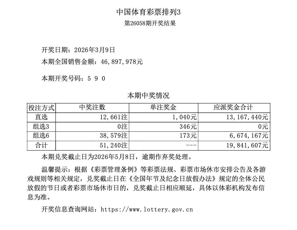 排列3 第26058期开奖 5 9 0
