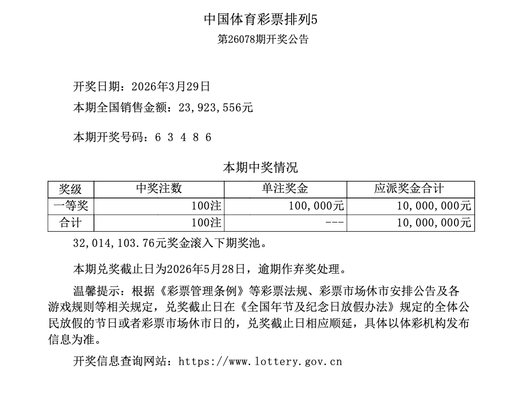 排列5 第26078期开奖 6 3 4 8 6