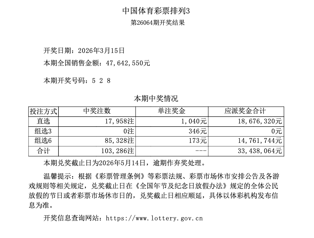 排列3 第26064期开奖 5 2 8