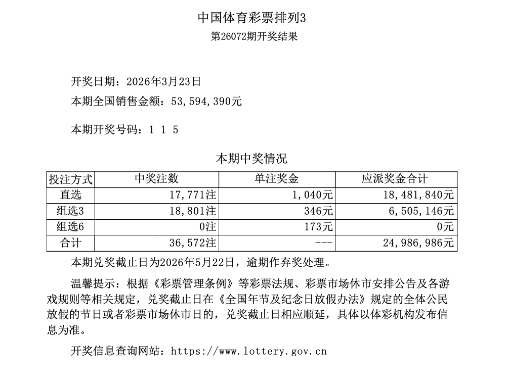 【排列3】第26072期开奖结果