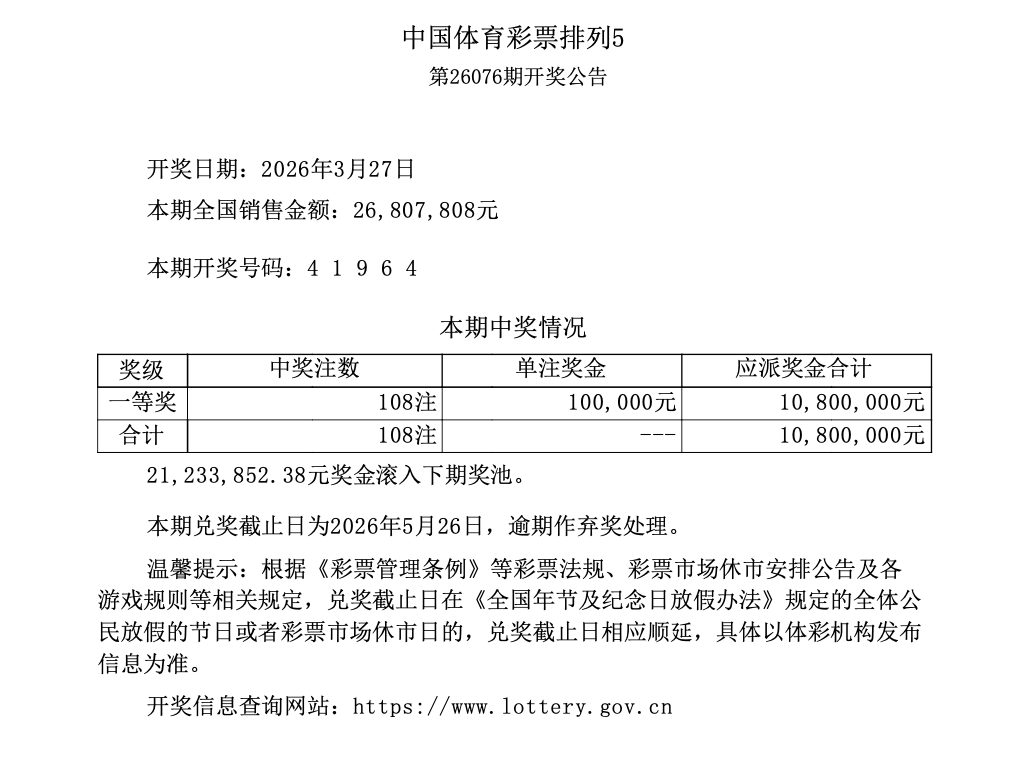 排列5 第26076期开奖 4 1 9 6 4