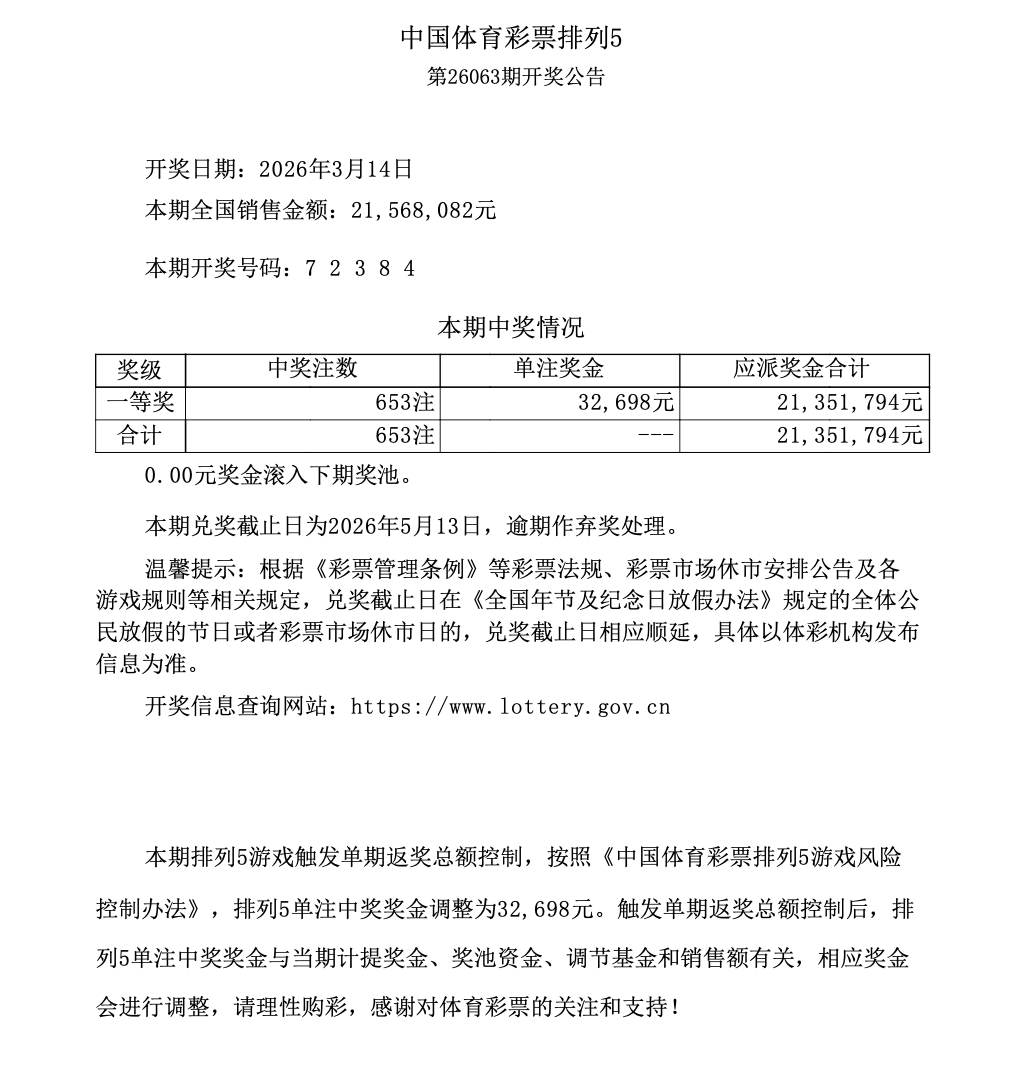排列5 第26063期开奖 7 2 3 8 4