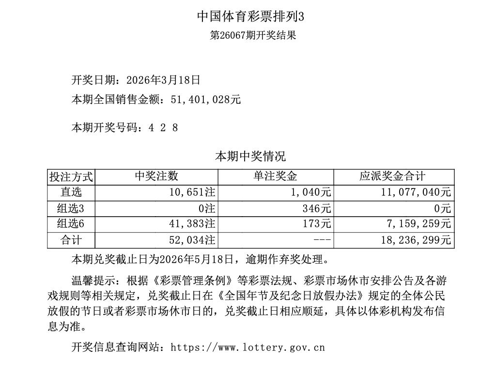 排列3 第26067期开奖 4 2 8