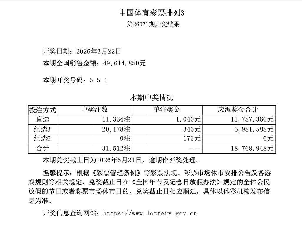 排列3 第26071期开奖 5 5 1
