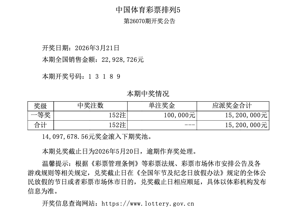 排列5 第26070期开奖 1 3 1 8 9