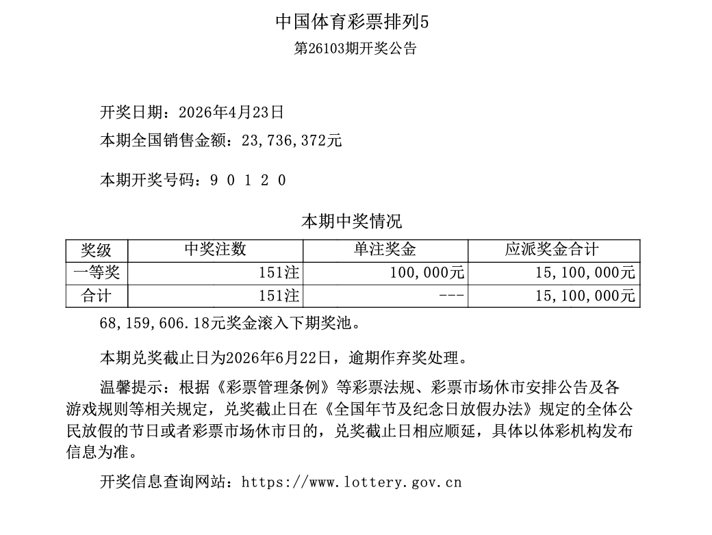 排列5 第26103期开奖 9 0 1 2 0