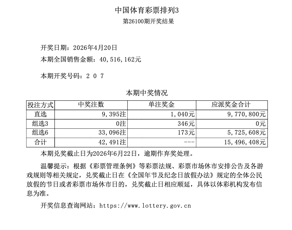 排列3 第26100期开奖 2 0 7