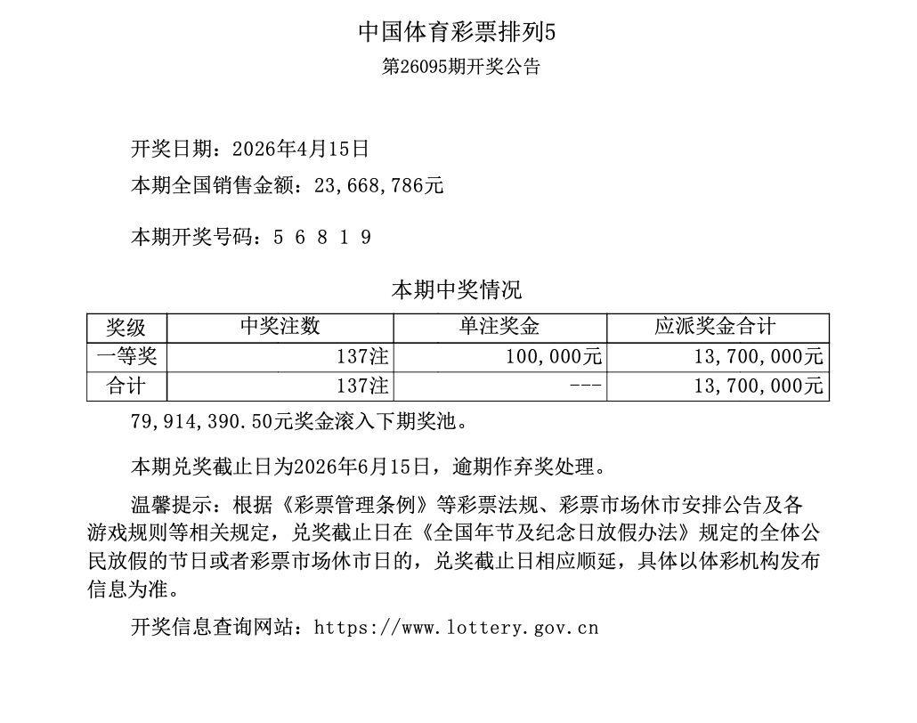 排列5 第26095期开奖 5 6 8 1 9