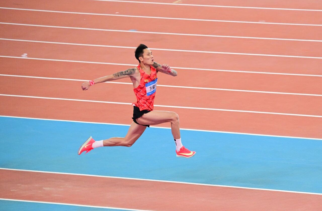 男子三级跳远决赛中,方耀庆与广东名将吴瑞庭、国家队选手朱亚明等顶尖高手同场竞技。预赛中仅跳一次有效成绩便蓄力决赛的方耀庆,眼神中透着对比赛的坚定。