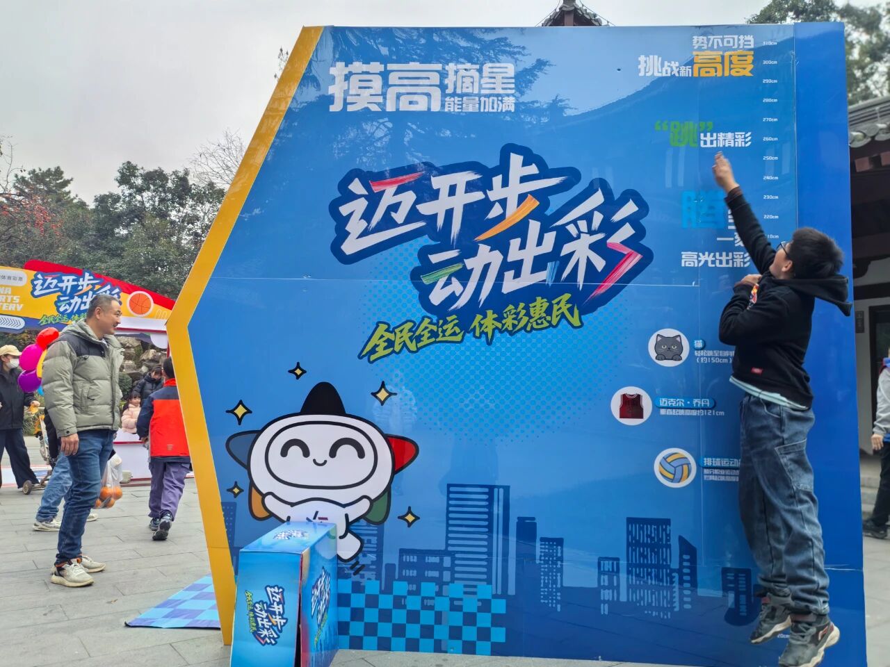 在运动打卡区中,“投出风采”和摸高挑战项目尤其受欢迎。参与者完成各区域打卡并集齐印章后,可领取相应奖品。