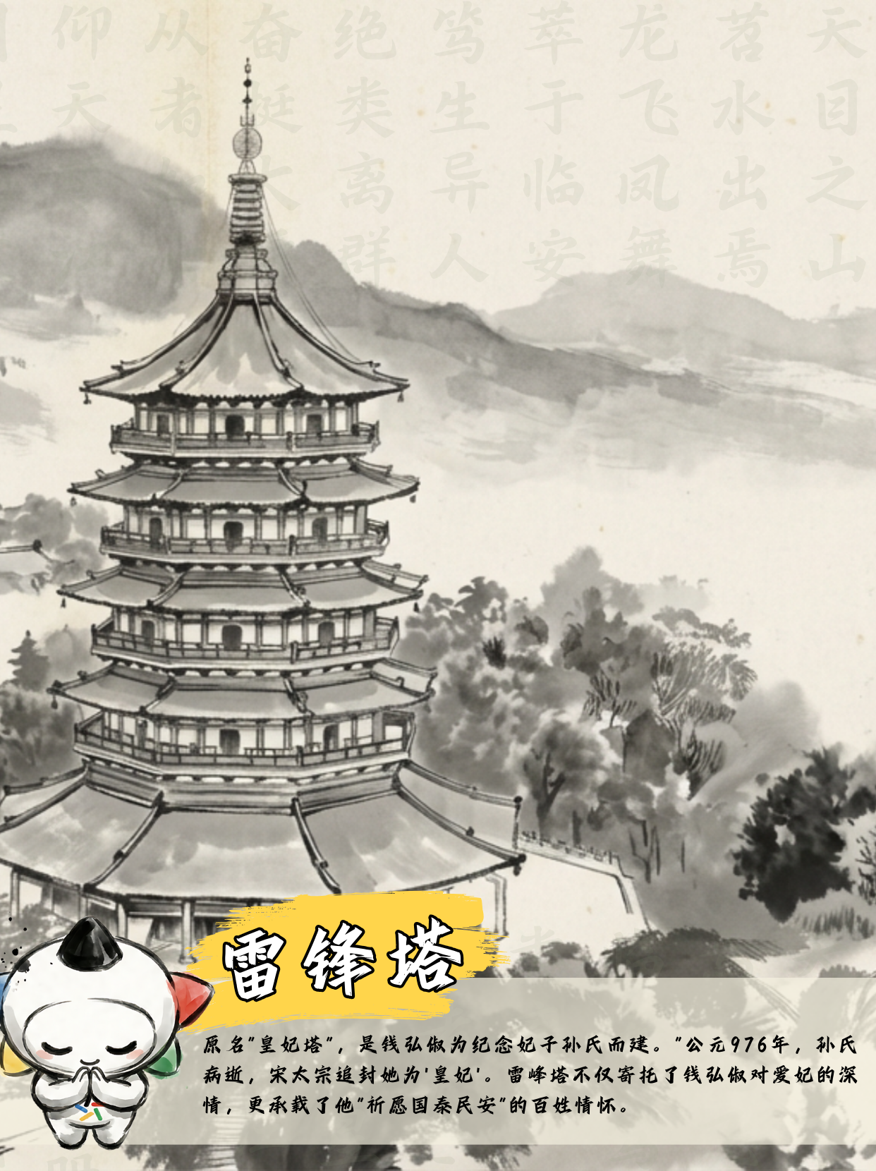 夕照山下,雷峰塔流光溢彩。当年钱弘俶建皇妃塔(雷峰塔),意在庆贺添丁,更在祈求“风调雨顺,国泰民安”。这座塔,寄托着对家国昌盛最宏大的愿景。