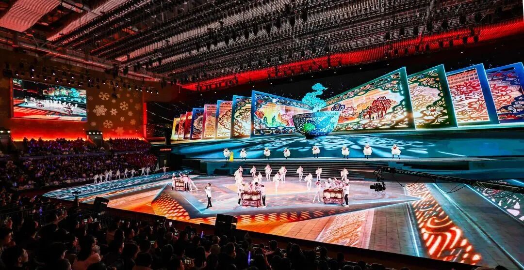 上篇《古脉新承》以“冰雪”为韵,描绘了一幅“大美陕西”的人文风情画卷,迎接全省冬运健儿热情欢聚。在《冬日映三秦》的节目中,冰花窗前映照着千年冬韵,新春乐曲呼唤着归乡游子。这场跨越山海的相聚,是冰雪联结的情谊,更是三秦大地敞开胸怀的赤诚盛情。最令人惊艳的是《潮音贯古今》中的“三秦风物展”,地面投影化作一幅百米冰雪长卷:陕南的腊肉暖锅雾气蒸腾,关中的羊肉泡馍香气仿佛穿透屏幕,陕北的黄米馍馍金黄诱人;羌族雪纹刺绣、冰上皮影戏、雪花剪纸渐次绽放。当舌尖品味烟火、指尖流淌传奇,传统与现代晕染出浓浓冬韵,文化自信在这片热土上蓬勃生长。