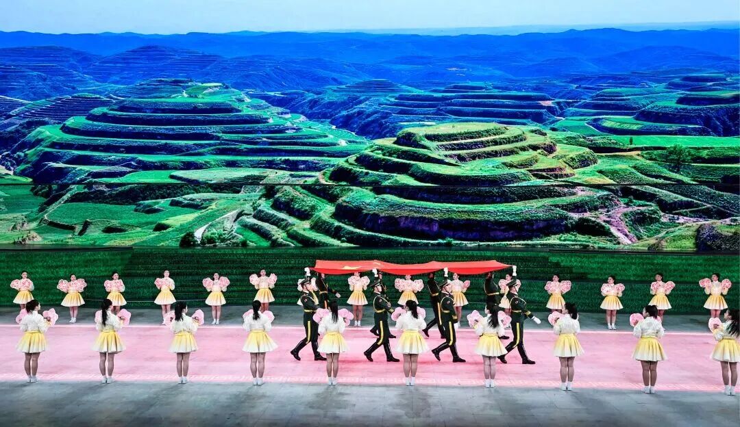 国旗入场,《东方红》旋律悠扬而起。大屏上铺展开一幅壮阔的黄河之景,随着画面变化,绥德师范、《沁园春·雪》手稿、延安宝塔山、八路军驻西安办事处旧址、马栏革命旧址、陕甘边革命根据地照金纪念馆等场景流动呈现。当8名仪仗队员高擎五星红旗,踏着《我爱你中国》的音乐铿锵走来,现场观众无不热血沸腾、激情澎湃。
