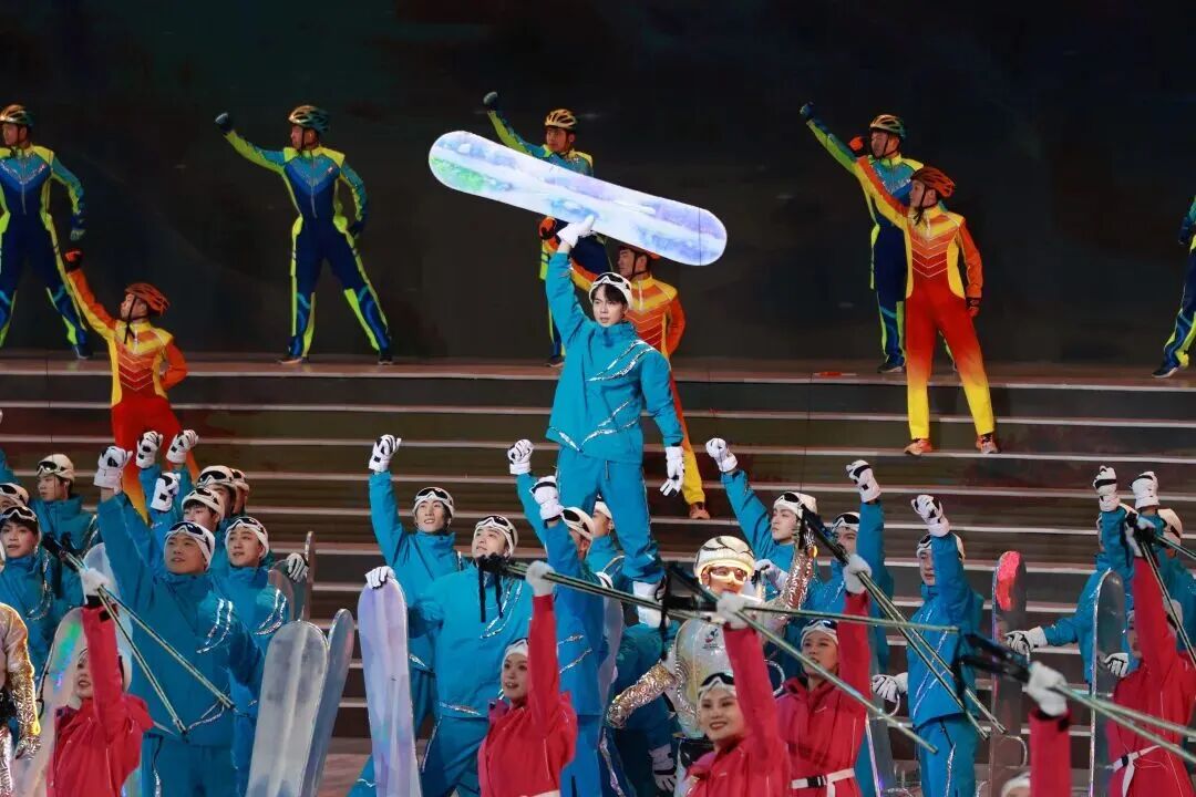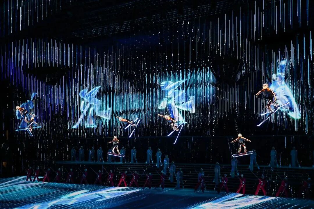 中篇《沸冬腾雪》以“运动”为景,呈现竞技冰雪运动的热血风采和群众冰雪运动的鲜活图景,将“冷运动”演绎成“热狂欢”。《冰封竞多娇》节目中,数控矩阵瞬间转换为高山滑雪赛道、速滑冰道、冰球场馆,威亚演员如飞鸟凌空,演绎跳台滑雪的惊险;地面舞者疾驰回转,再现短道速滑的激情。而《雪飘看今朝》节目将三秦大地冰雪运动融入大众生活、全民健身蔚然成风的时代画卷徐徐展开,彰显了“三亿人参与冰雪运动”的生动实践与陕西冰雪产业的无限魅力。