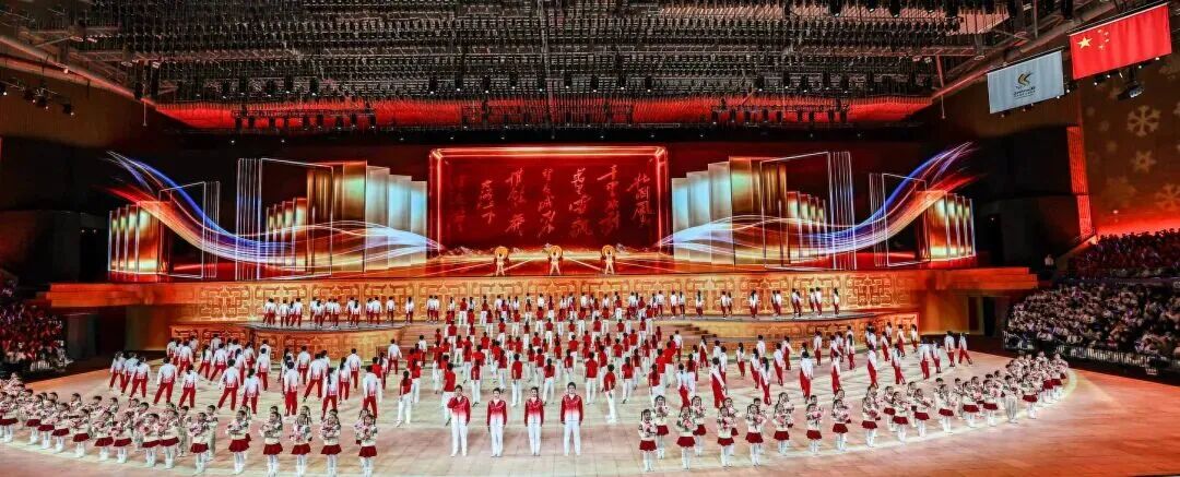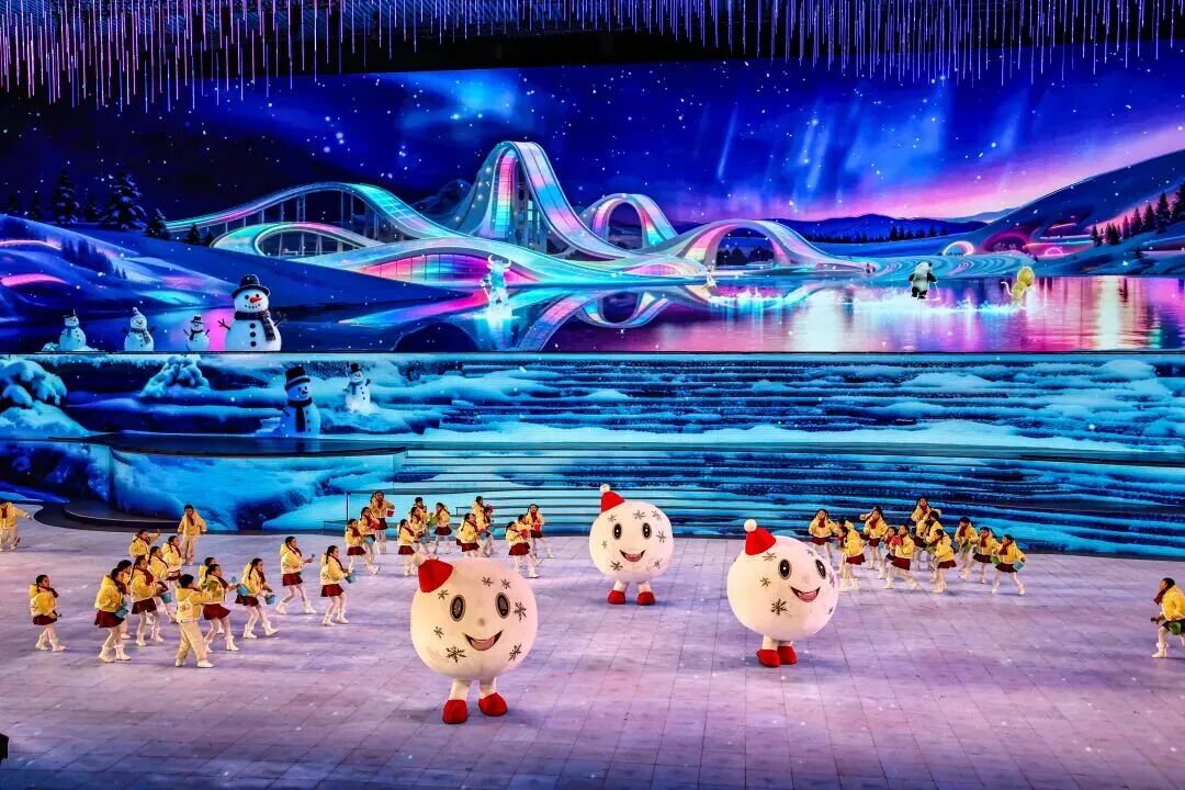 文体展演以深厚的文化内涵、宏大的艺术视野和精巧的创意构思,打造出一场融合冰雪魅力与时代气息的视听盛宴。演出以《沁园春·雪》的壮阔场景开启三个篇章,依次呈现“千里冰封”“山舞银蛇”“红装素裹”的史诗级视觉画卷,实现诗意的动态演绎与美学升华。