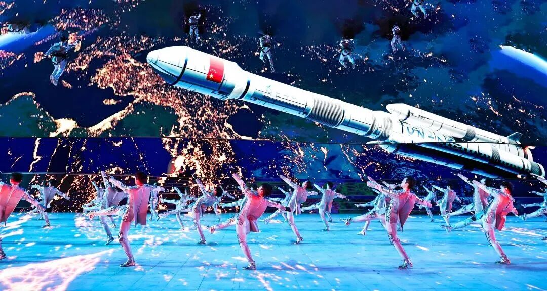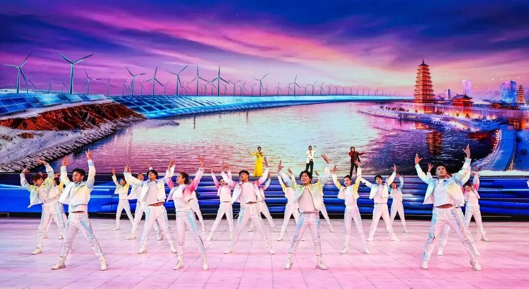 下篇《陕耀未来》以“未来”为轴,凝聚三秦儿女追赶超越谱新篇、砥砺奋进新征程的昂扬斗志,指向一片更辽阔的天地。《追赶展宏图》节目中,一株“生态能源之树”破冰而出。根系是煤矿井下智能开采的影像,枝干是太阳能板与风力发电机的抽象造型,叶片则由雪花晶体构成。舞者手持光影万花筒,折射出陕北治沙绿洲、关中科创走廊、陕南生态保护区的景象。节目《超越谱新篇》将气氛推向高潮,老中青少各代人群与陕西各地行业代表携手登台,以铮铮誓言朗诵长诗《再诵沁园春》,将冰雪运动的力量、精神与梦想升华为新时代陕西追赶超越的奋斗篇章。