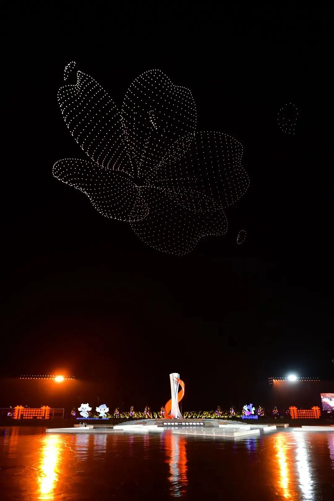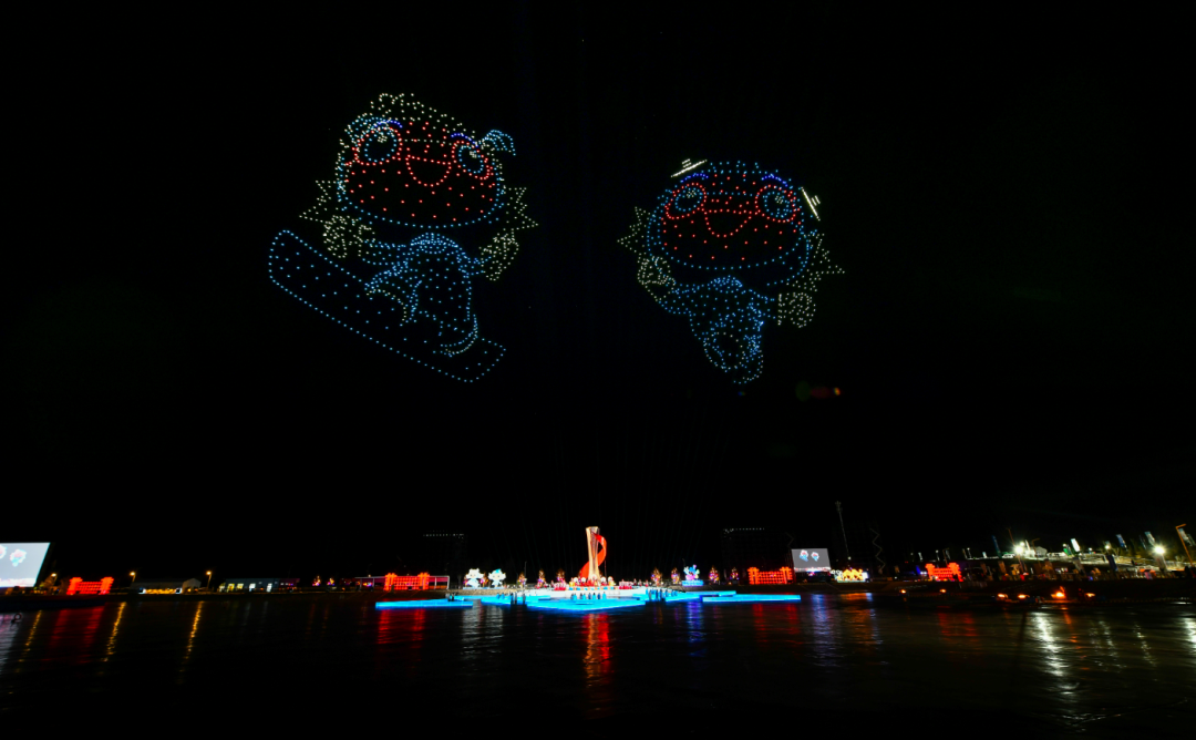 紧接着,主火炬塔后方升起的无人机编队化为冰雪精灵,呈现运动激情、冰雪奇观、榆林文脉、陕西符号与新春气象的璀璨交响,最终勾勒并点亮本届冬运会主题口号“逐梦冰雪 陕耀未来”,于塞北苍穹绘就陕西冬运的活力图腾。
