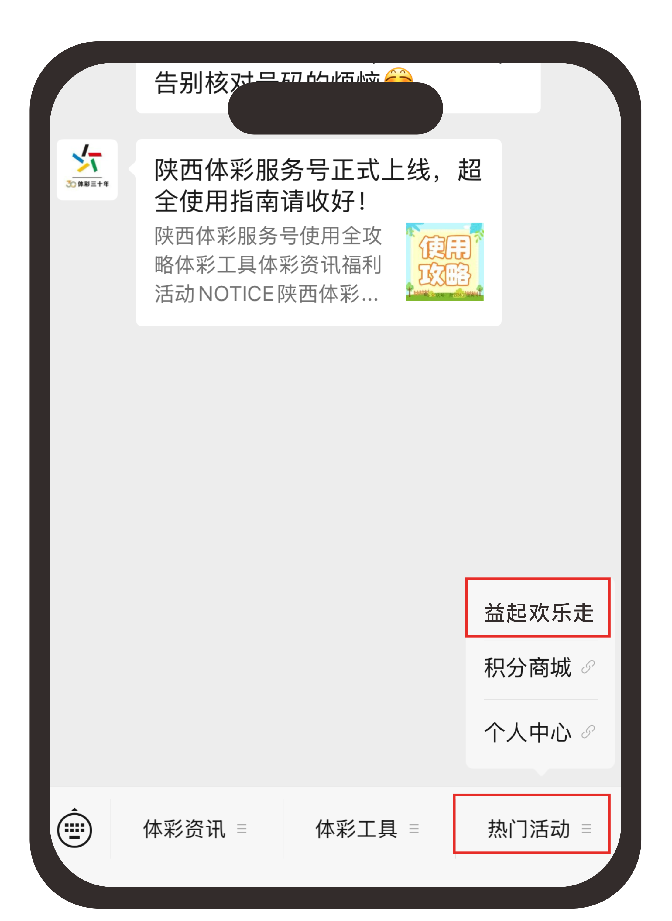 4、进入陕西体彩服务号底部菜单选择【热门活动】点击【益起欢乐走】。