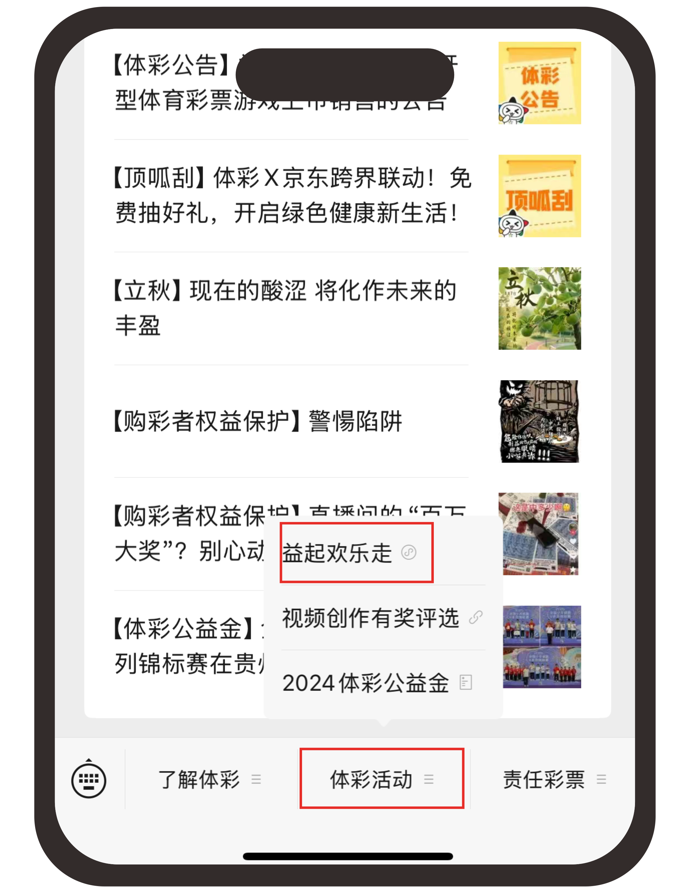 3、进入陕西体彩公众号底部菜单选择【体彩活动】点击【益起欢乐走】。