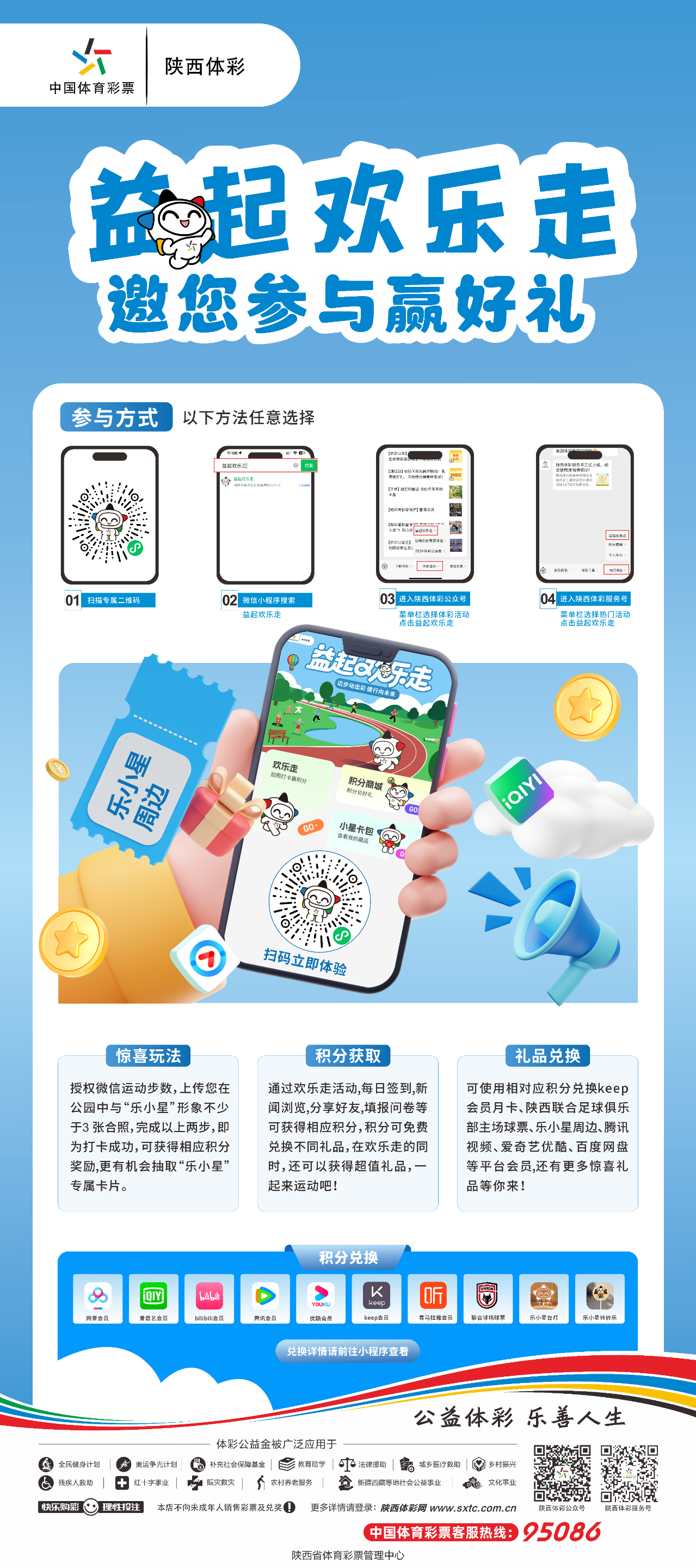 益起欢乐走是由陕西省体彩中心精心打造的集运动健康、公益与趣味互动于一体的微信小程序,让您在轻松迈步、享受运乐趣的同时,为公益事业添砖加瓦,赢取丰厚的积分好礼。