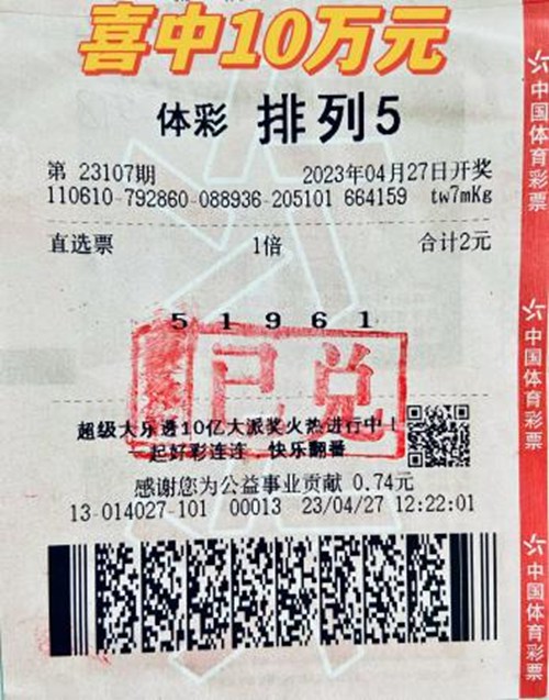 体彩排列5第23107期开奖,中奖号码是“5、1、9、6、1”,宝鸡购彩者杜先生(化姓)中得1注10万元大奖。